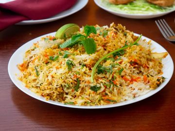 Savory basmati rice that includes layers of vegetables array of spices, ginger, garlic, rice and aromatics that are steamed together with onions.
